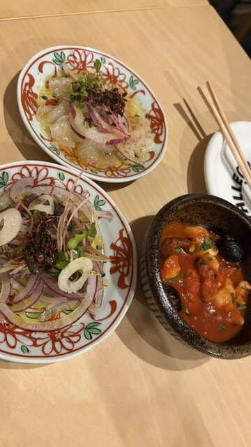 カルパッチョ3種(中とろ・かつお・平目)は、ちょうどいいサイズ感で鮮度抜群。さすが魚屋直営の美味しさ!