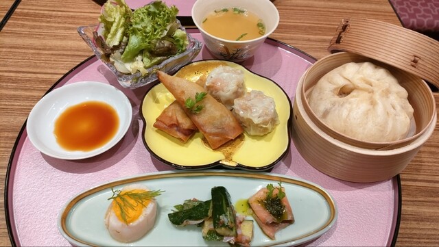 豚まんのセットはサラダ、スープ、春巻、シュウマイ、前菜3種、豚まんとアイスクリームです。