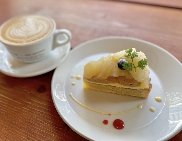 光がたっぷりと差し込むガラス張りの開放的な店内には、コーヒー豆の焙煎スペースとカフェスペース。奥には、ケーキ工房が併設されています。
