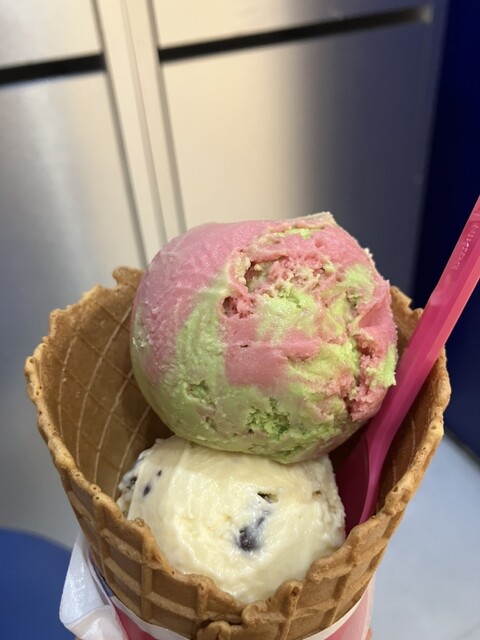 試食させていただいたフレーバーが美味しかったので、季節限定のアイスクリームにしました。どちらも美味しかったです。店内に3人ほど座れる椅子がありました。久々にいただきましたが、ワッフルコーンも美味しかったです