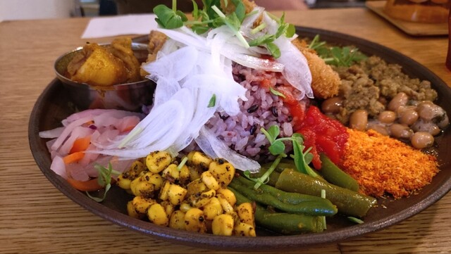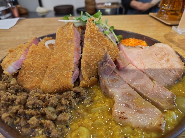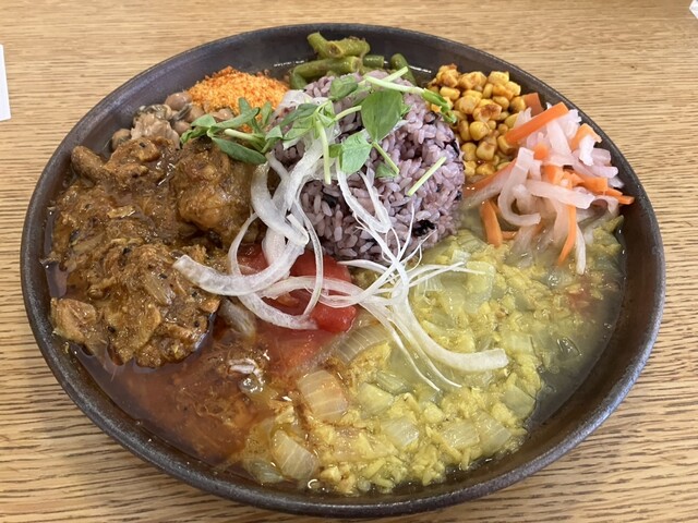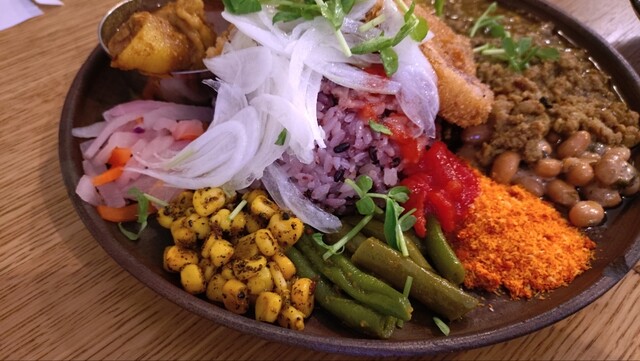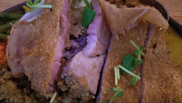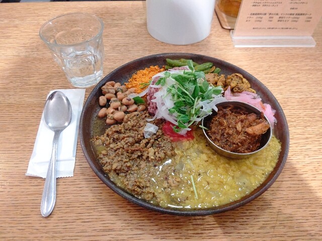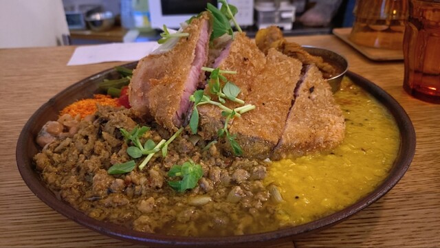 夫婦で夕食に訪問 入り口はおしゃれなカフェのよう。店内に入るとBGMもカレー屋というよりカフェ。白を基調にした清潔感のある店内では、感じの良い女性のシェフがワンオペで提供しているようでした。 2人とも出汁キーマ(1200円)、日替わりカレーのあいがけ(300円)を注文、本日の日替わりはチ... 詳細を見る