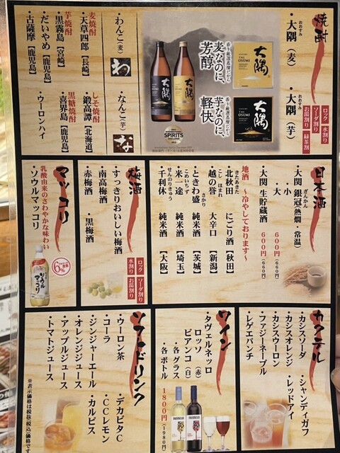 | ドリンク | 日本酒あり、焼酎あり、ワインあり、カクテルあり |