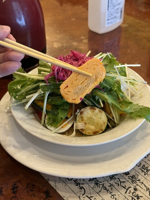 サラダにはだし巻き卵とゆで卵が半分、オムライスとたまご、めちゃ使ってます。