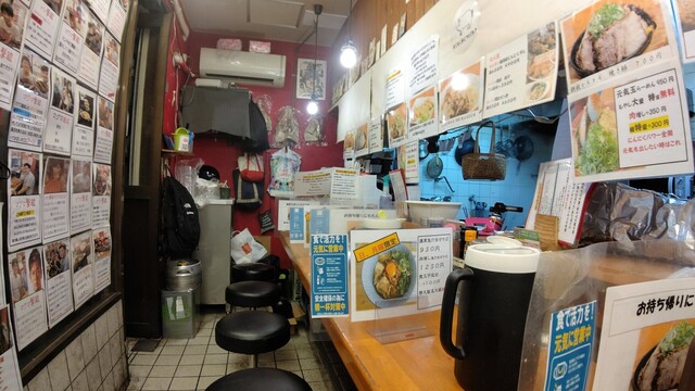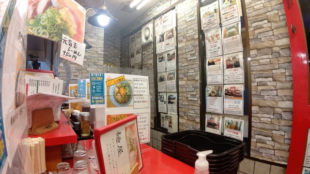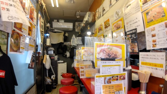 店内は厨房を囲むL型カウンター10席のみ。壁という壁に各種ラーメンメニューとともに、芸能人のサインやチャレンジメニューの達成者の写真が貼り出されていて実に賑やかです。
