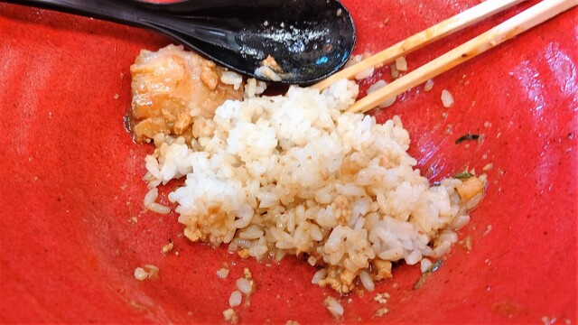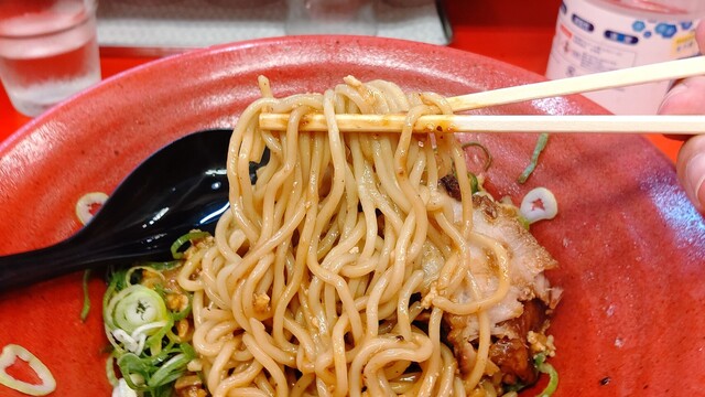 麺は多加水のモチっとした風合いで程よいコシが感じられるが、ややベタっとした感がある。よく混ぜたつもりだが味にムラが出てしまうのは、麺の解れがよくないからでしょう。