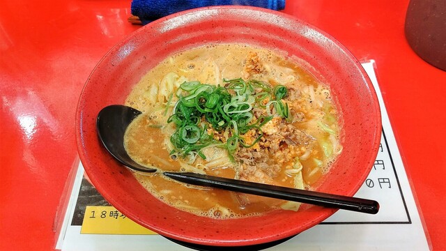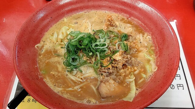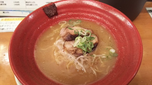 それほど待たずして差し出されました。赤色の器の中に赤褐色のスープが満たされ、葱とともにこのお店の特徴である分厚いチャーシューが乗せられています。それにしても辛そう。
