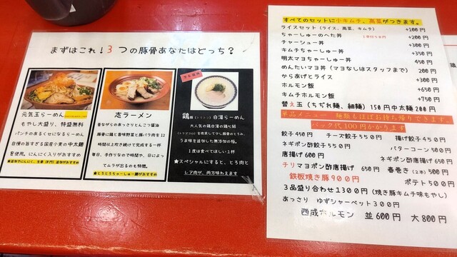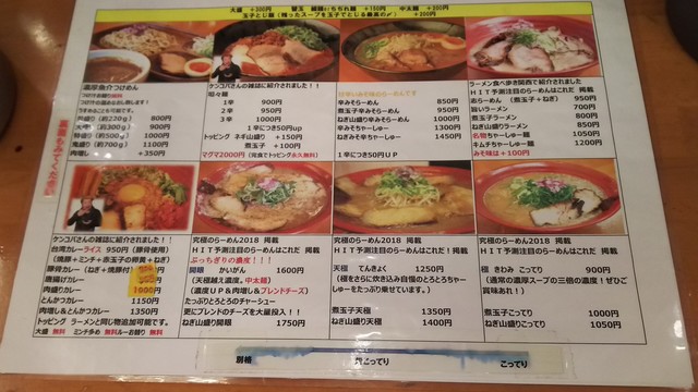 メニューは豚骨屋台味を標榜する旨いらーめん(700円)を基本に、みそらーめん(800円)、辛みそらーめん(850円)こってり(900円)、汁なし油そば(850円)、つけ麺(800円)など。これに煮玉子、ねぎ盛り、キムチ等のトッピングや、餃子や唐揚げといったサイドメニューも用意されてるようです。