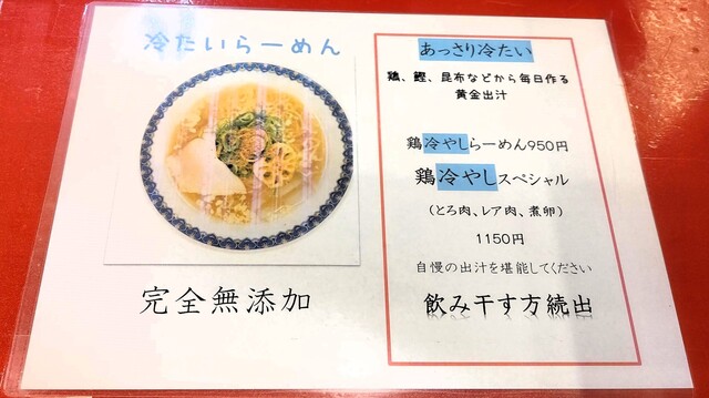 ラーメンメニューは実に多彩かつ複雑怪奇のため、いつもすぐに決めることが困難だが、今回はすぐに決まりました。「鶏冷やしらーめん」(950円)です。酷暑に日に「冷やし」は特に魅力的ですね。