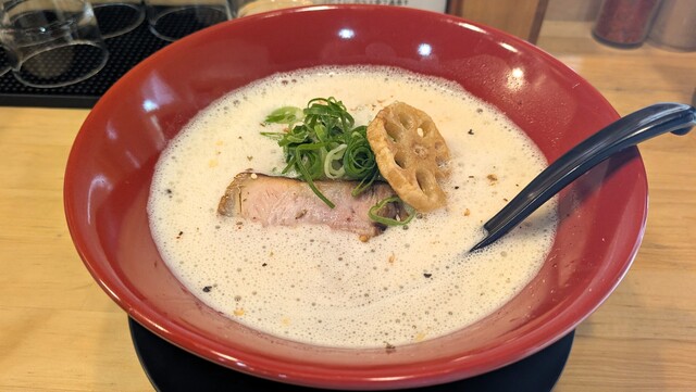 そう待たずして運ばれてきました。逆富士山型の器に上面が泡立つ白濁したスープに麺が沈み、厚切り叉焼と素揚げの蓮根が乗る実にシンプルなヴィジュアルです。