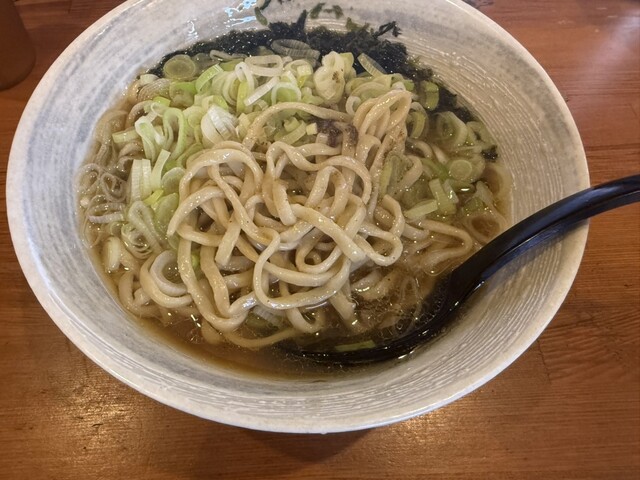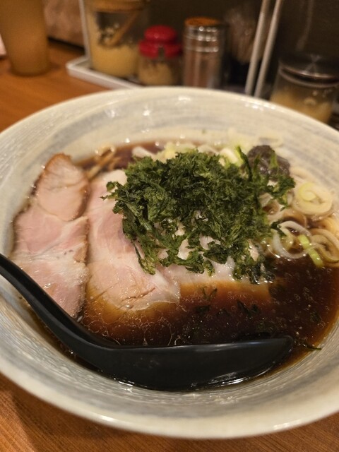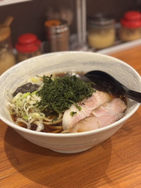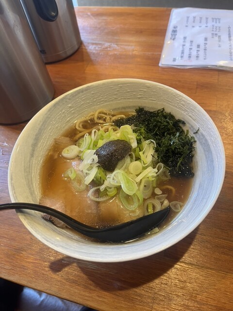 らぁめんは、魚粉やアオサがたっぷりと乗っており、スープも突き抜けた魚系。