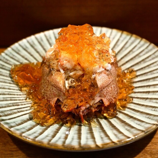 前菜の蟹のジュレがけは上品な甘みと旨味が凝縮されており、思わず唸る美味しさ。