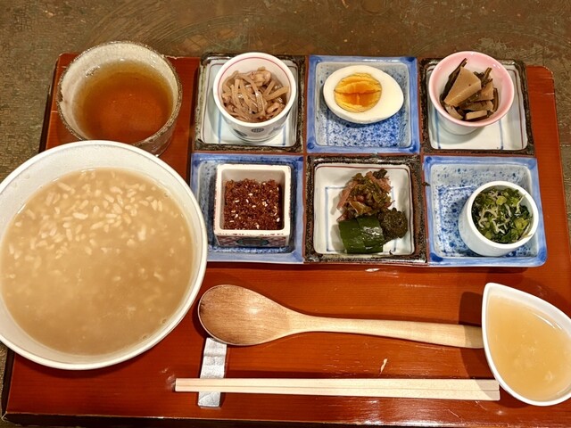 セットについている出汁をかけることで、おかゆの味に旨みが加わり素晴らしいハーモニーに