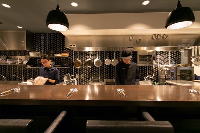 店内はカウンターメイン、オープンキッチンを擁する落ち着いた空間。おひとり様もお気軽にどうぞ。