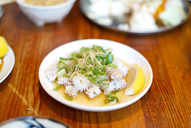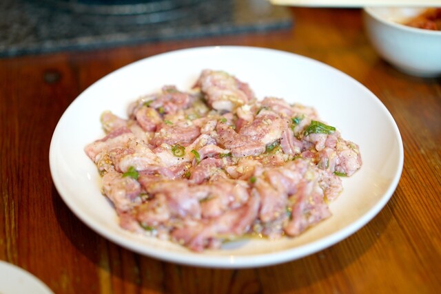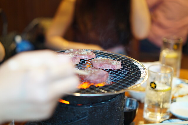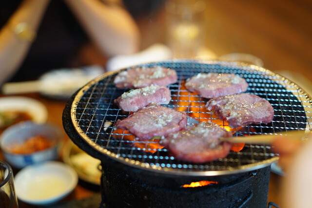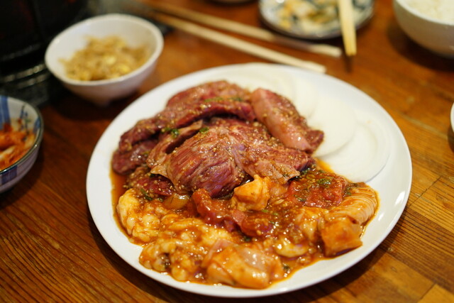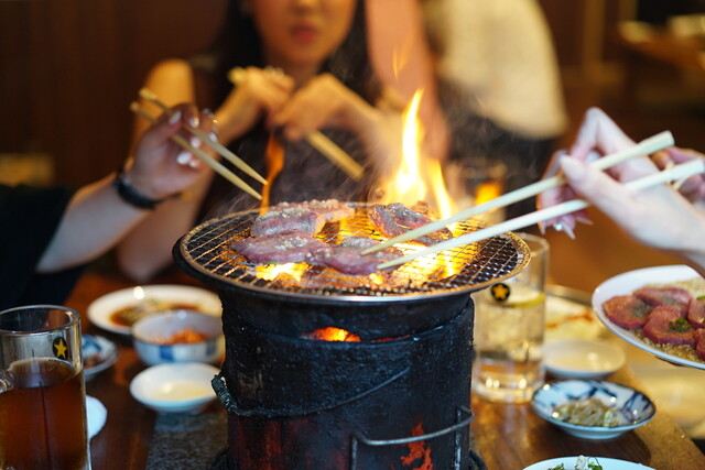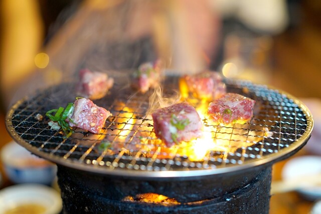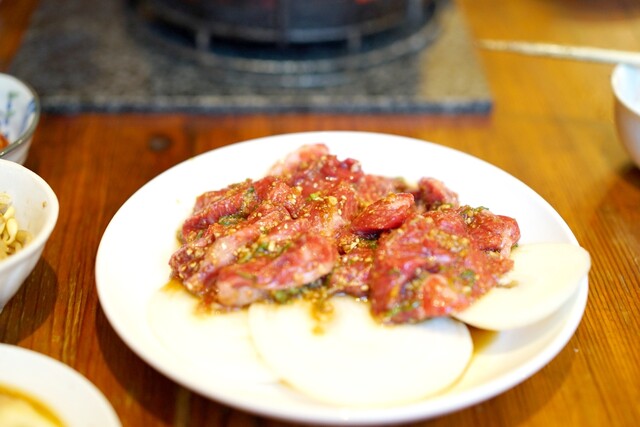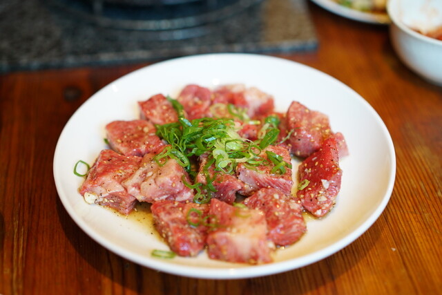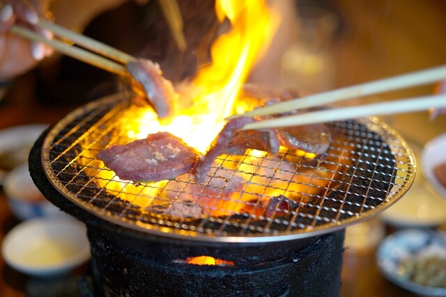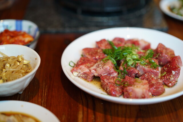 ミノサンドがブロック状なのは、ジューシーに焼けるようにという、店主から肉への愛。いまや大阪が誇る焼肉クリーンナップの1軒。基本は自家製揉みダレだが、歯応えの塩ハラミ(950円)、柔らかさの塩バラ(950円)など、全メニュー塩にも対応。かなりイケる。1番バッターはもちろんブロック状の生レバー(750円)である。鶴橋駅からワンメーター程の距離があるのでタクシーで。「永和信用金庫を東に入って一つ目の信号...」でもう目の前。「今日絶対ミノサンド!」に賛同する仲間と駆けつけよう。店主・万ちゃんに「お任せで!」と告げれば、その日のイイ肉を見繕ってくれる。
