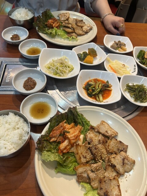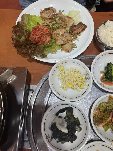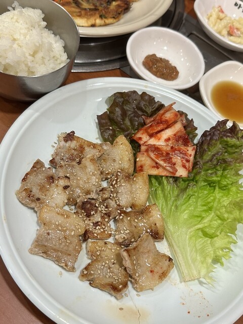 チヂミは友達と半分こして、私は別でサムギョプサル定食を食べました。