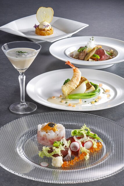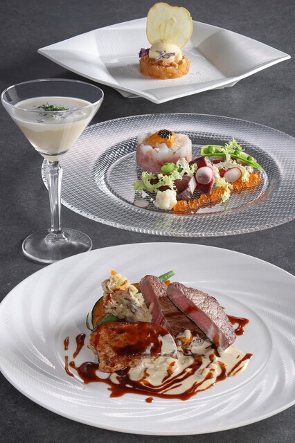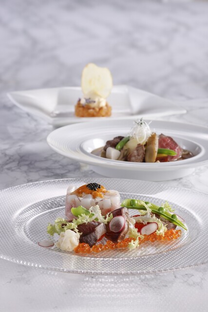アースカラーを基調としたシックな店内。 障子をモチーフにした窓から注ぐ、優しく穏やかな光。 和と洋の魅力が融合した寛ぎの空間で、フレンチをベースとした繊細なコース料理からカジュアルメニューまで、バラエティ豊かなテイストをお届けいたします。 ラウンジでは、香り豊かなコーヒーやアフタヌーンティー、スイーツで、午後の優雅なひとときをお過ごしください。