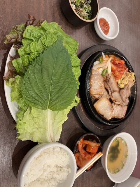 ◆豚の三段バラ肉を香ばしく焼き上げる『石板サムギョプサルセット』は1280円(税込)~