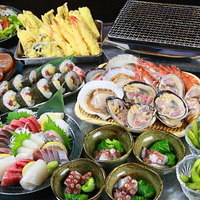 海の幸をたっぷり楽しめる飲み放題付きの大満足コース!お造りや海鮮サラダ、さざえや有頭えびを豪快に焼き上げた「浜焼き」など海鮮尽くし!人気の揚げたてサクサクの天ぷら3種(エビ・白身魚・野菜)もついた当店自慢の魚八コースです。 ※写真はイメージです