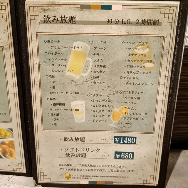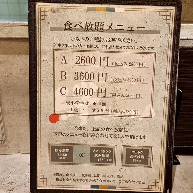 | サービス | 2時間半以上の宴会可、お祝い・サプライズ可、テイクアウト、複数言語メニューあり(英語、中国語繁体字、中国語簡体字、韓国語)、複数言語対応スタッフ在籍(中国語、韓国語)、写真付きメニューあり |