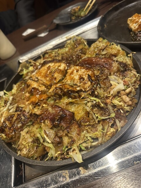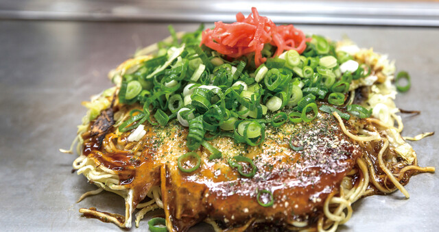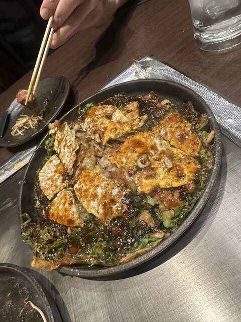 生地にたっぷりの野菜とお肉を重ねて蒸し焼きにし玉子と合わせる事によりミルフィーユのような焼き上げ、オリジナルの甘みのあるソースで仕上げる当店自慢のお好み焼き