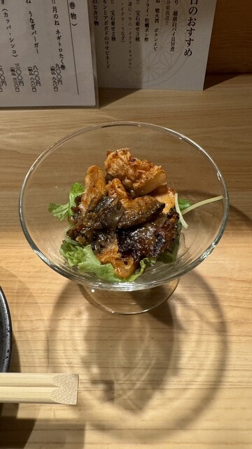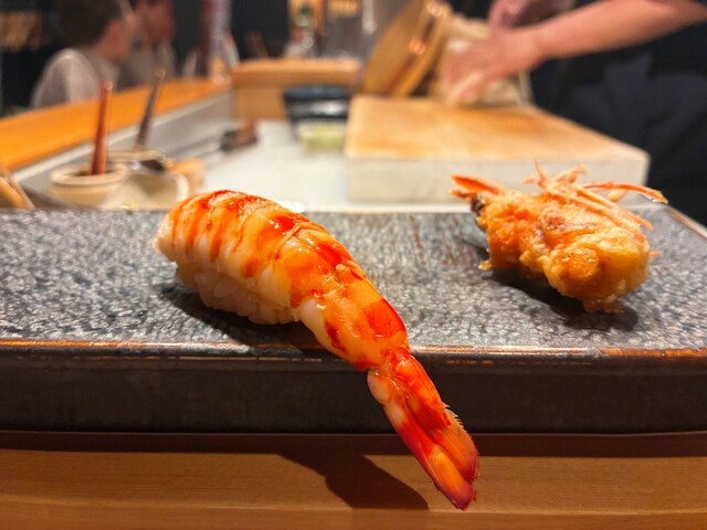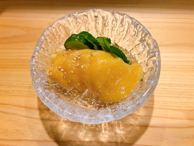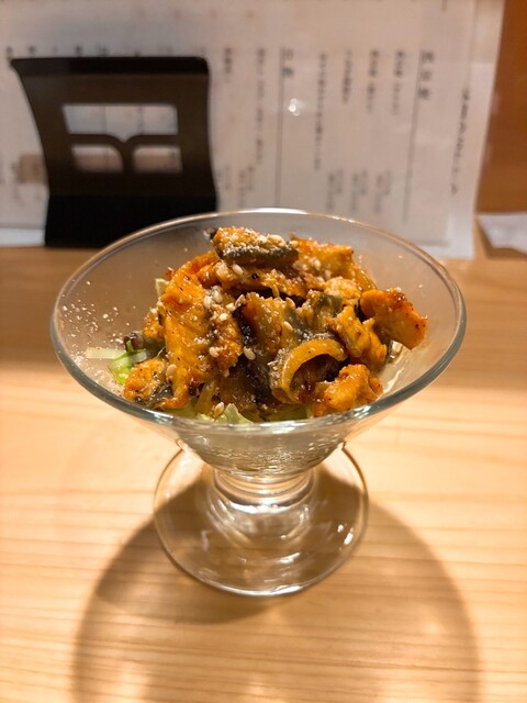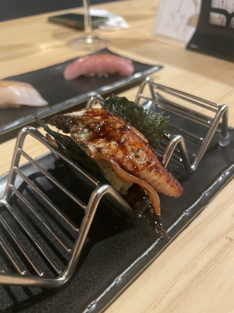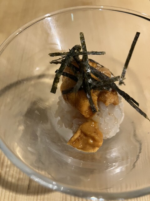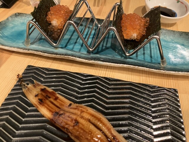 久しぶりに来訪。 喜楽長と突き出しはうざく。 喜楽長にはたっぷりのお冷やも一緒に出してくれる気遣いが嬉しい(^^) うざくは温かく、お店の方の笑顔も暖かい❣️ 蟹身の宝石乗せ3種(ウニ、いくら、キャビア)1650円。 赤酢飯はかなり少なめ。 海苔で上品に巻いて一口で食べられます。 ... 詳細を見る