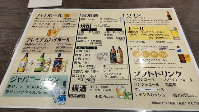 | ドリンク | 日本酒あり、焼酎あり、ワインあり、カクテルあり、日本酒にこだわる、ワインにこだわる |