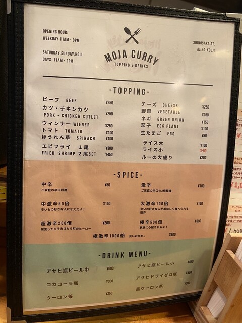 一度食べればやみつき必至!独自ブレンドのスパイスと、じっくり煮込んだ深みのあるルーが自慢の【モジャカレー】。旨味と香りのバランスにこだわり、辛さの中にもしっかりとコクを感じられる味わいです。トッピングも豊富で、気分に合わせてカスタマイズ可能。ランチから夜ごはんまで、どんなシーンでも満足いただける自信があります。ぜひ一度、当店こだわりの“クセになるカレー”をご堪能ください |
