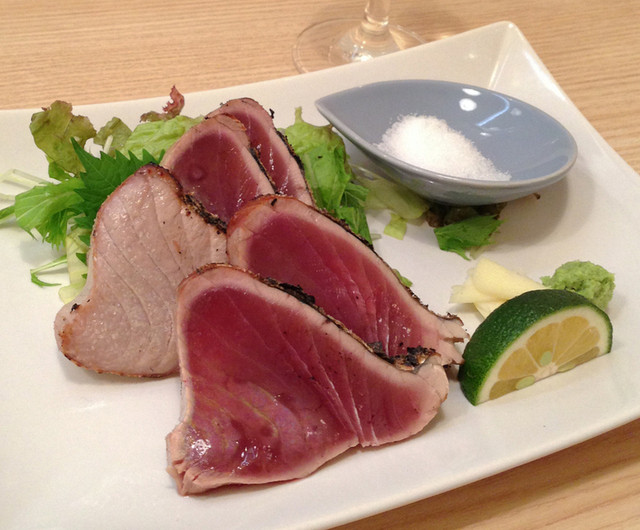 今日はワイン好きになりたい!という女子大生と一緒だったので、まずはTAKIZAWA Winery のナイアガラのスパークリング。軽いナイアガラの香りと爽やかな喉越し。こちらのお店お勧めのカツオといただきます。