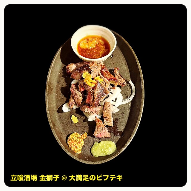 1週間ぶりのアルコール解禁するのにもってこいの立喰酒場 金獅子さんへ。 せっかくなので瓶ビールに合うアテで整いたくてメニューを吟味した結果、網焼き肝スペシャル、和牛チレ刺身(塩ゴマ油)、大満足のビフテキをオーダー。 普段はハイボールメインながら久しくアルコールを絶ってからのビールは群を抜... 詳細を見る