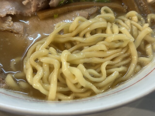スープは、油分多めで鶏ガラに節なんかの魚介類に醤油ダレである。上には魚粉が掛かってる。一口飲んでみる。熱々で煮干しの風味があって旨味が広がるなあ。あっさりと言う事やけど、しっか...