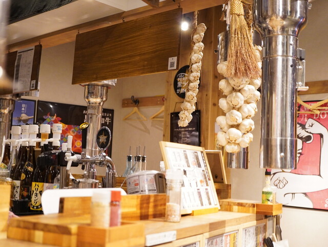店内に吊るされているにんにくはこだわりの国産で、にんにくの聖地である青森県田子町より直送されたものだけを使用。