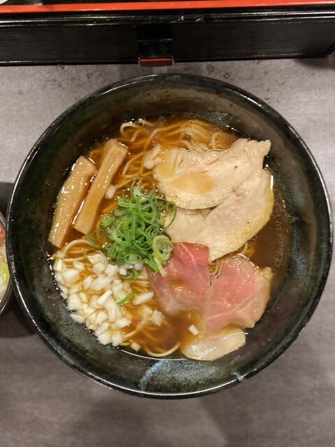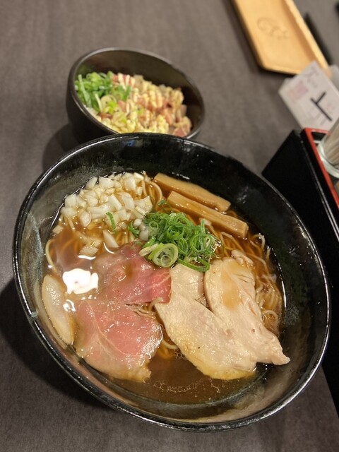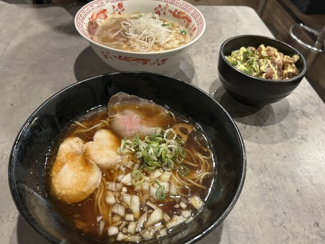 鶏白湯醤油ラーメンと鶏と魚介の醤油ラーメン、そしてランチセットの豚チャーマヨ丼。