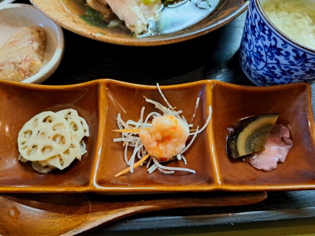 漬物、前菜3種、サラダ、スープ、メイン、ライス付きという構成。