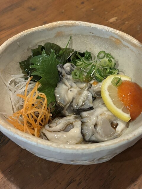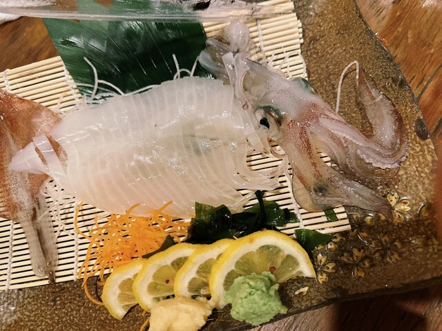 ヤリイカの姿造り小、生牡蠣ポン酢、カキフライ