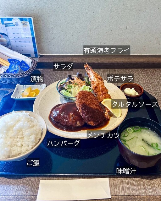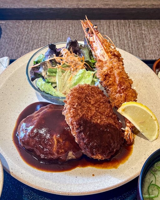海老フライにハンバーグとミンチカツのトリプルメイン