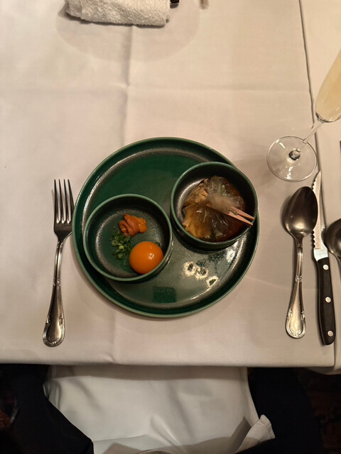 カルパッチョ?西京味噌ソースとピスタチオのソース、ブリと大根とカルパッチョ風の味がしました。