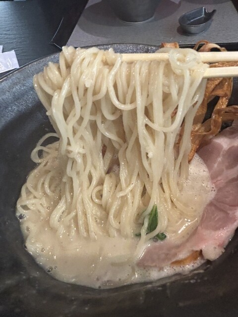 スープは鹿児島・桜島鶏を使用。まるでポタージュのようなクリーミーな味わい。チャーシューは、鶏・豚肩ロースの2種類。鶏は、朝引き地鶏を使用し低温調理法で、しっとり。