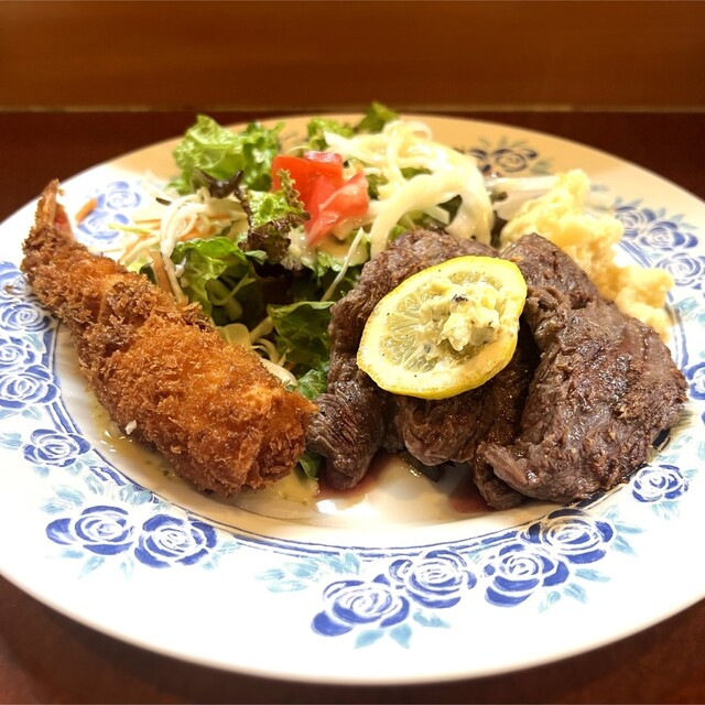 1番人気のまんぷくランチ(エッグハンバーグ+チキンカツ@1,100円)は売切れとの事だったので『スペシャルランチ(本日のステーキ150g+エビフライ@1,8...