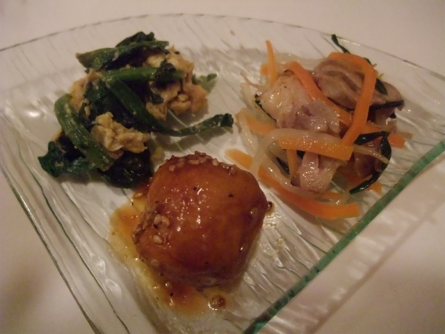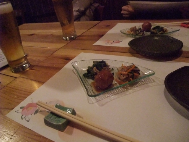 木の香りがほのかに残る温かなテーブルに、ひと皿ずつ丁寧に届く料理たち。最初にいただいたのは艶やかな茄子の小鉢。藍色の硝子器に映えるその姿は、まるで夕暮れに沈む夏の影のよう。柔らかな茄子にひとさじの冷気があり、口に含むと静かに解けていきました。