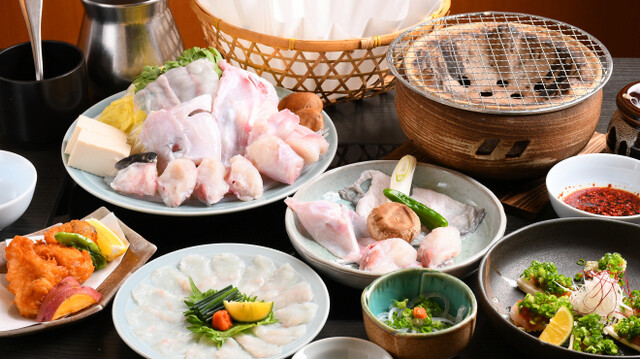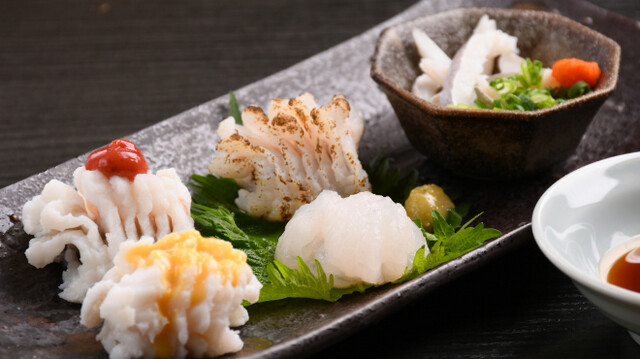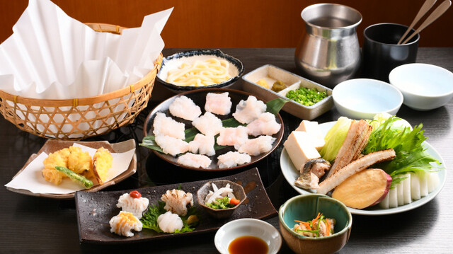 当店の看板メニューは、新鮮なフグを使用した料理。捌きたてで提供するフグは、動くことがあるほど鮮度が高く、しっかりとした歯ごたえや旨みを味わえます。お集まりには肉厚なフグが自慢の「焼きフグコース」がおすすめです。また夏には、鱧の天ぷらや鱧すきが並ぶ「鱧コース」が登場。旬の味覚をたっぷりお楽しみいただけます。半個室のお座敷とテーブル席を完備し、美酒佳肴を囲む宴会はもちろん、会社の飲み会にも最適です。