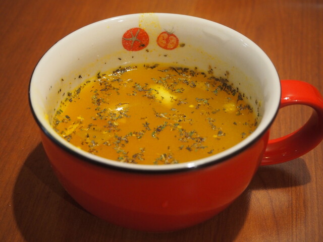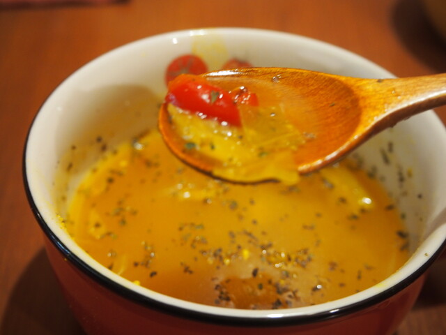 こちらは刻まれた野菜とレモンが乗っており、ミネストローネスープからコンソメとベーコンの風味を抜いて、酸味と辛味を効かせたようなあっさりとしながらもピリッとくる独特の...