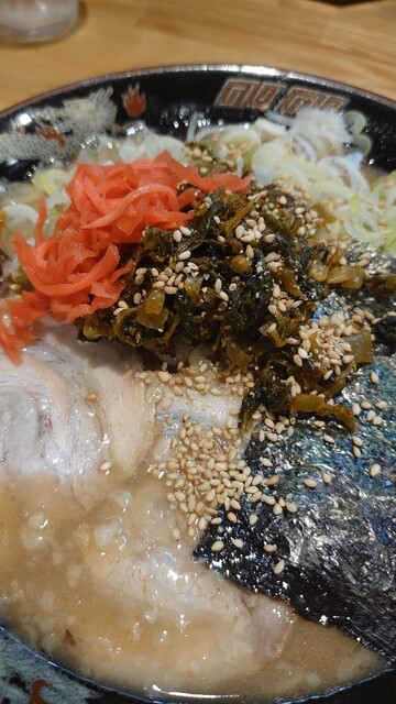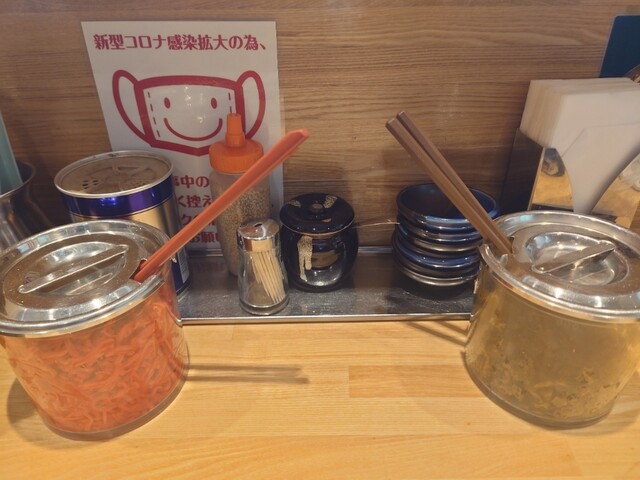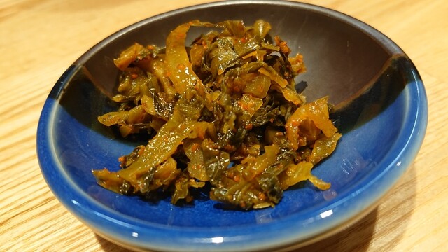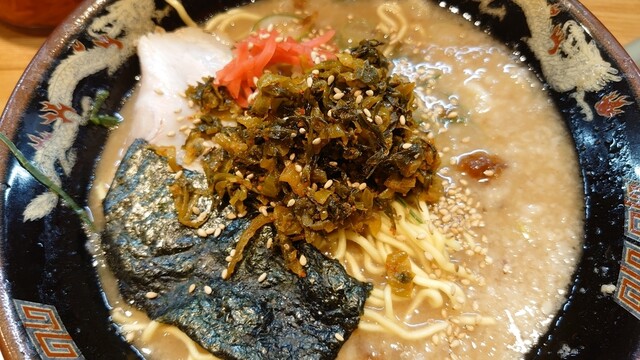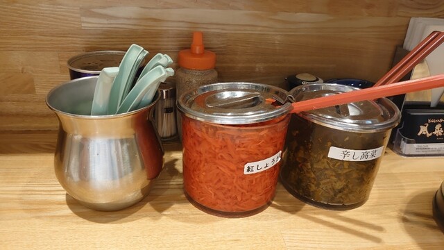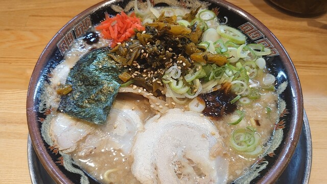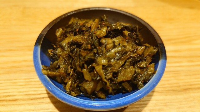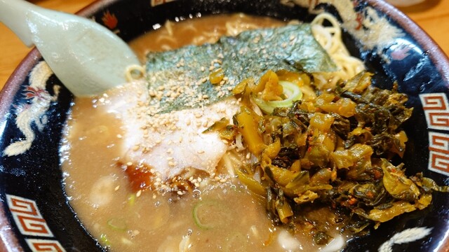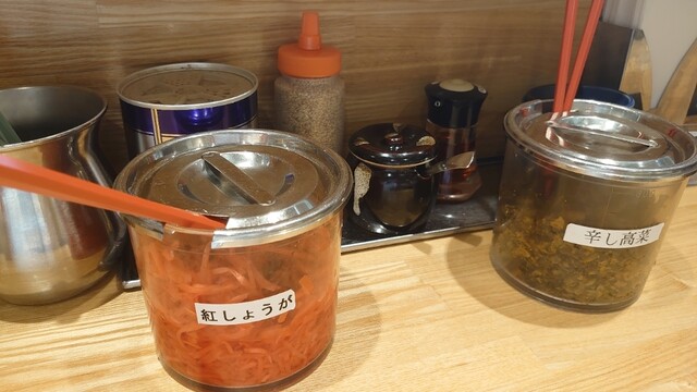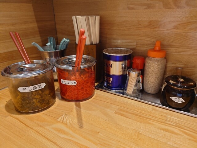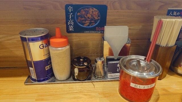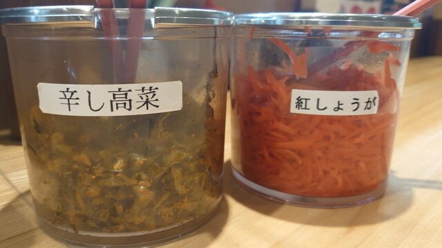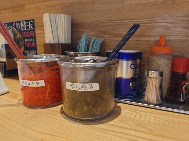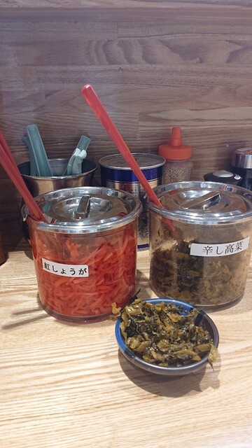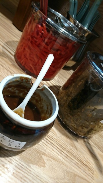 有料になったピリ辛高菜(50円)も注文し、ニンニクショウユをドバドバっと…