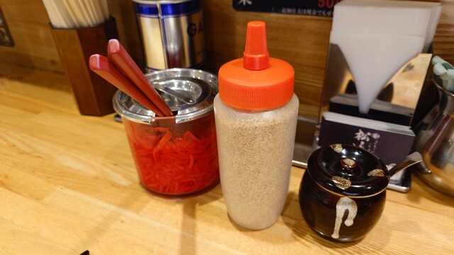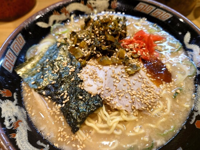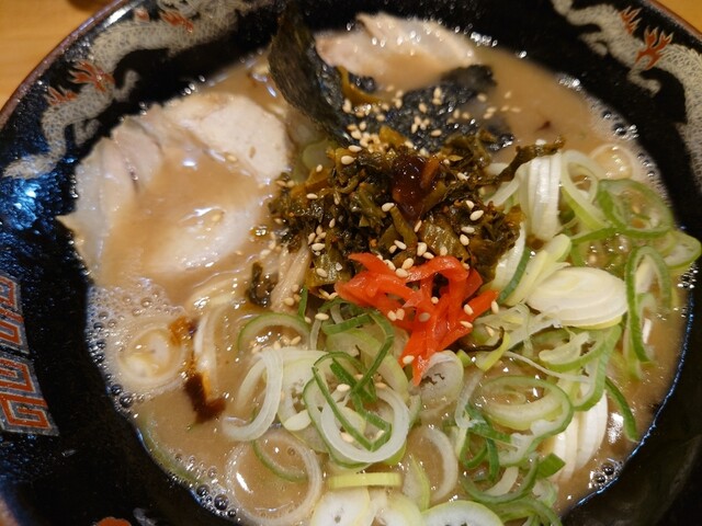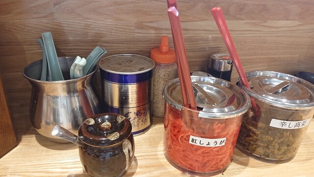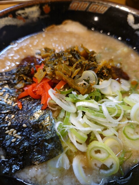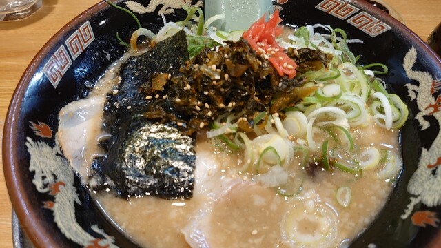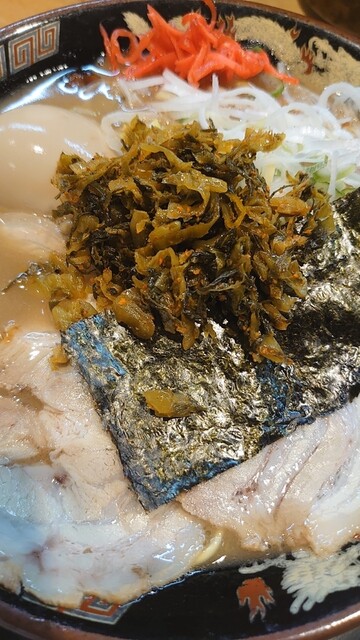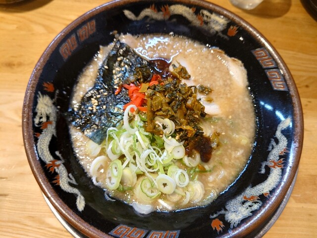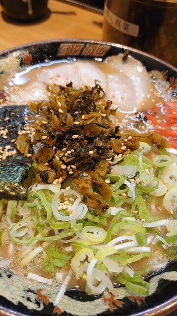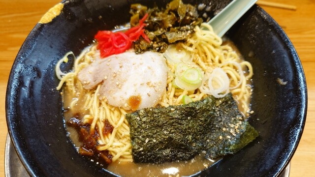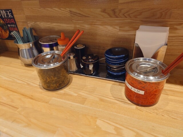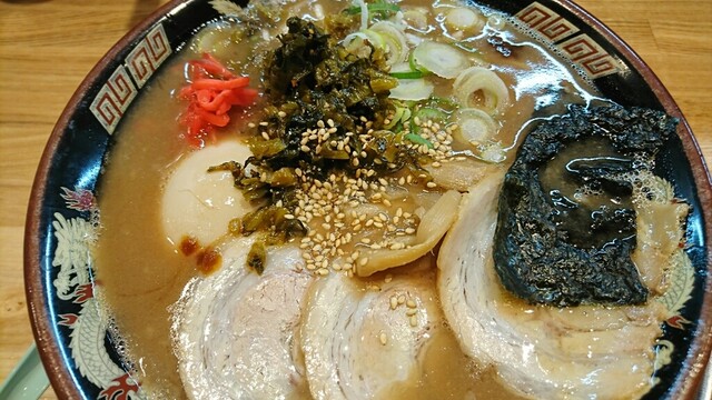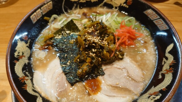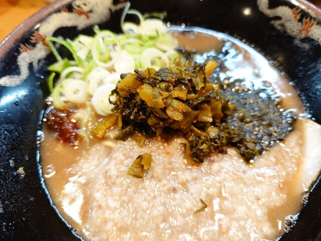 有料になったピリ辛高菜(50円)も注文し、ニンニクショウユをドバドバっと…