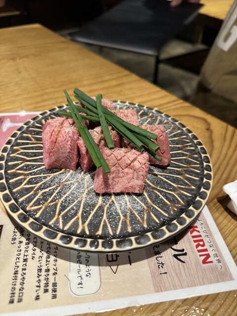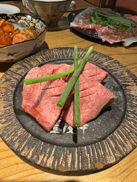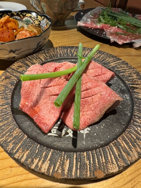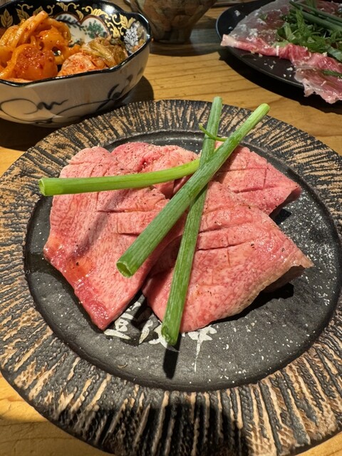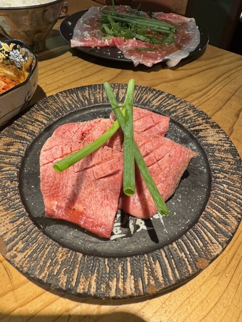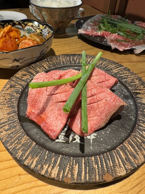 大分県の豊後牛の専門焼肉店 お肉のクオリティにこだわった 鮮度抜群の美味しいお肉が食べれます . 日替わりでラインアップが変わる お肉がおすすめ ◎大判上モモ 1枚750円 めちゃ柔らかくて美味しい お店の方にネギを巻きながら焼いて もらえます ご飯の上に乗せていただきました . タン塩大好きでここのお店のタン推し☺️ ◎上タン塩1,350円 分厚くてもサクッと噛み切れ... 詳細を見る