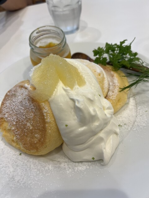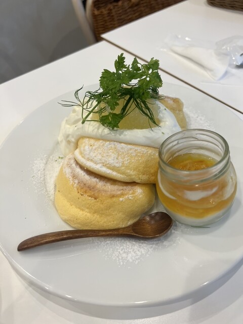 ✢厚焼きスフレタイプのパンケーキが楽しめる。