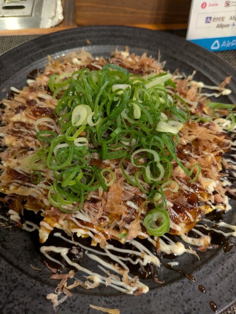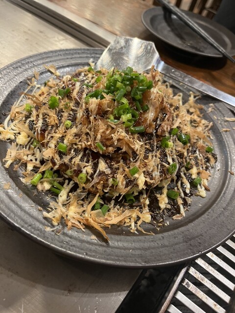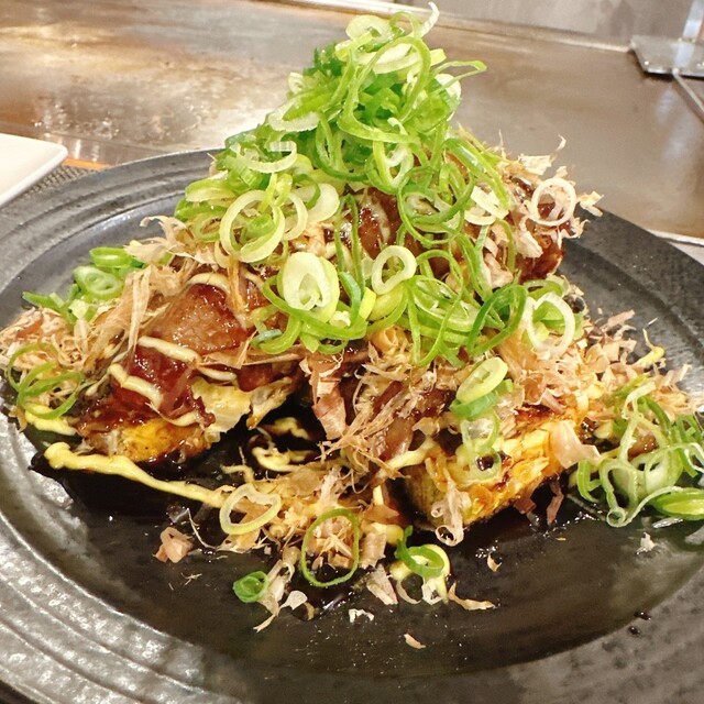 お好み焼きは豚派!なので注文。ふわっとしていて旨味も存分に味わえるお洒落なお好み焼き。
