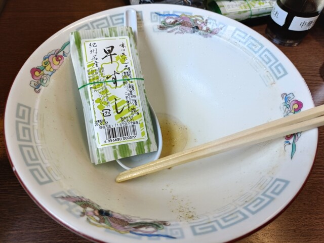 中華そばを注文し、出てくるのを待つ間にテーブルの早寿司をパクりと。美味しい♪