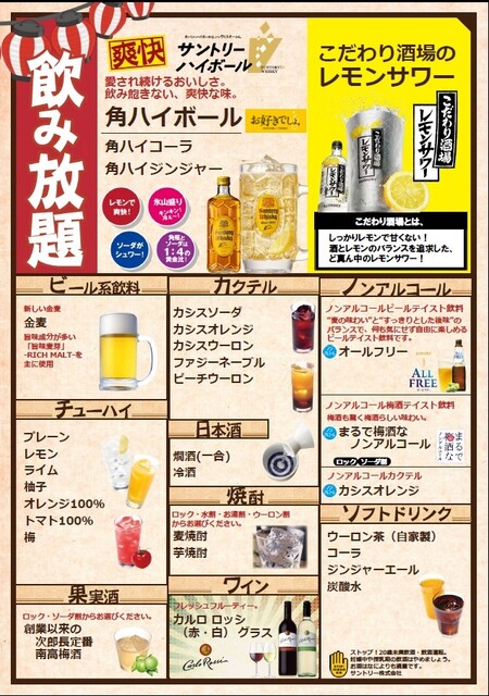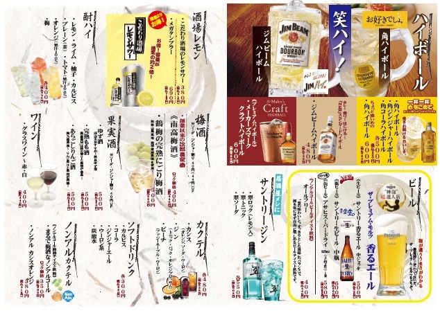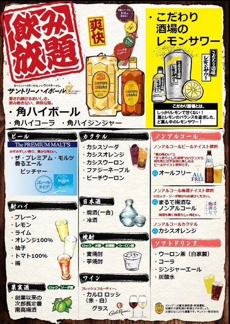 | ドリンク | 日本酒あり、焼酎あり、ワインあり、カクテルあり、日本酒にこだわる、焼酎にこだわる、ワインにこだわる |