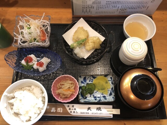 阪南市で創業50年を迎える割烹大規です。 地元獲れたての海の幸と、毎朝収穫される無農薬野菜 。素材の味と職人の魂と真心込めた、お料理が堪能 出来ます。中でもボリューム満点のランチに お値打ちのチラシ寿司。南紀直送の鮪トロ握りが絶品! 一度蒸してから焼き上げる江戸前穴子に、手作りおばんざい、 活けの新鮮なお魚が自慢! カウンター10席、4名個室を3部屋、テーブル席32席 お座敷32席と法事や会食で好...評を頂いております。 お酒の席でも、(会席御注文の方のみ送迎〜16名まで)がございますので、 安心!広くて落ち着いた店内で至福の一時をお過ごし下さい。 お子様連れや、ご家族様でのご来店大歓迎です。