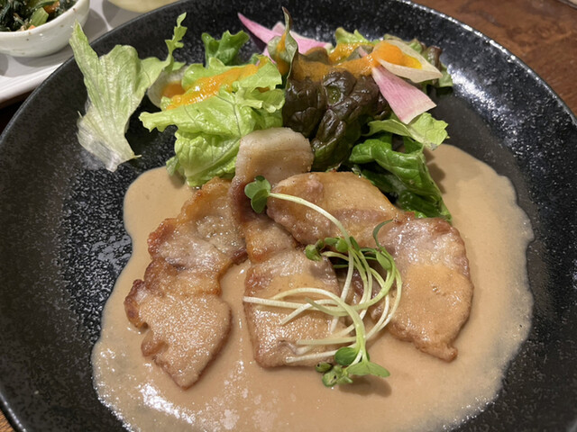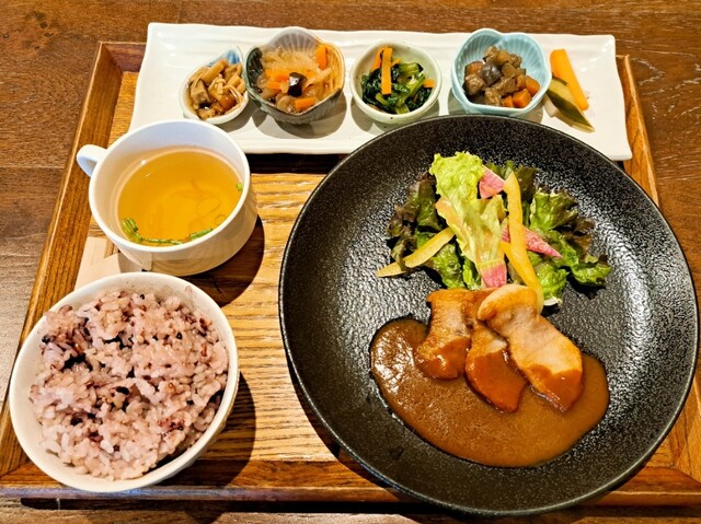 岡町駅から徒歩10分のところにある、古民家風の建物で営業されています。 日替わり定食を注文。 5種類の野菜料理はシンプルでやさしい味わいです。 薬膳スープはとても味わい深く、とても身体が温まる感じがありました。 この日のメインはグリルチキンでした。 脂身の少ない鶏肉でよかったです。 タレが絶品で、鶏肉とよく絡めて美味しくいただきました! デザートには是非、ロースイ... 詳細を見る